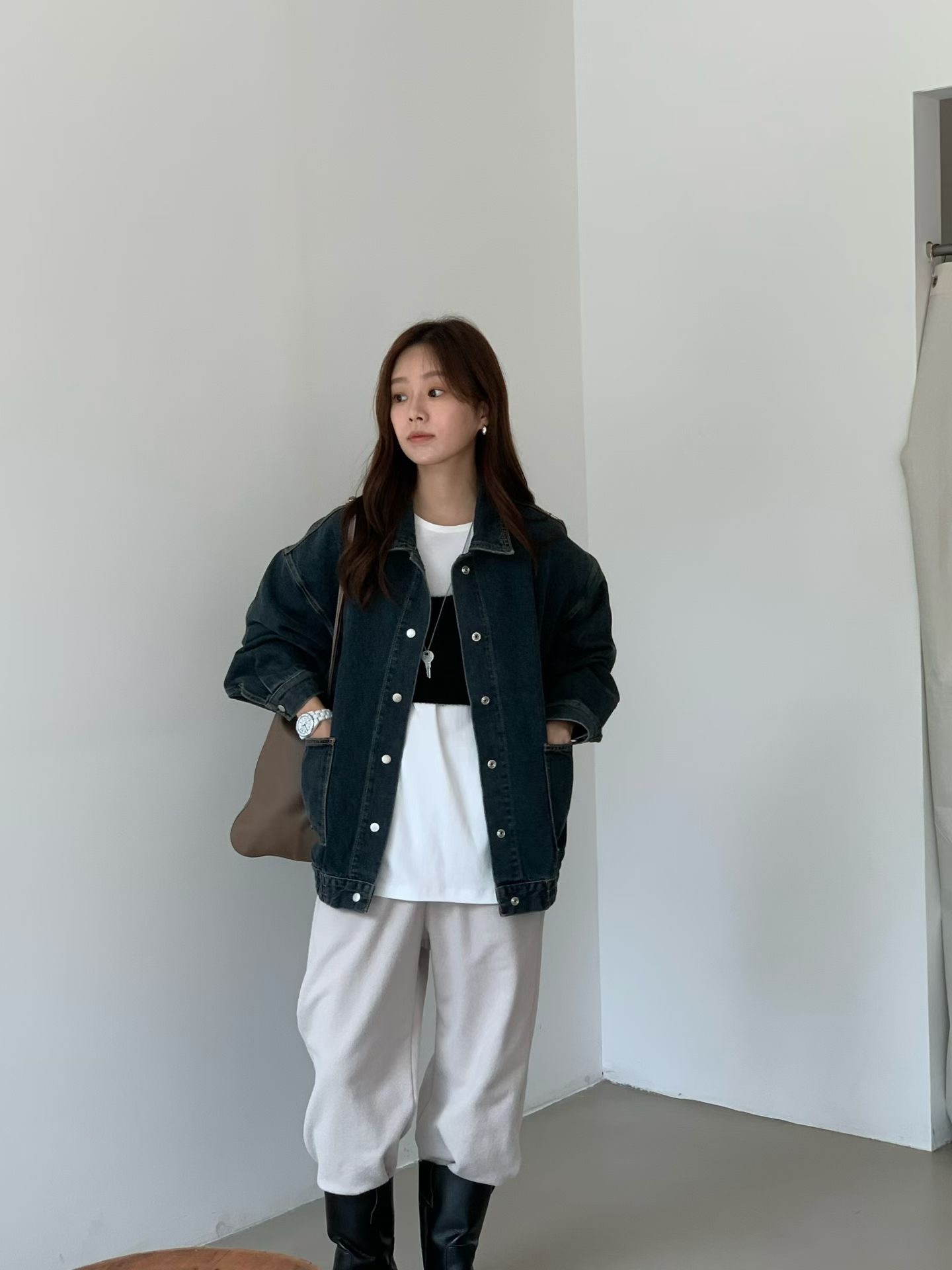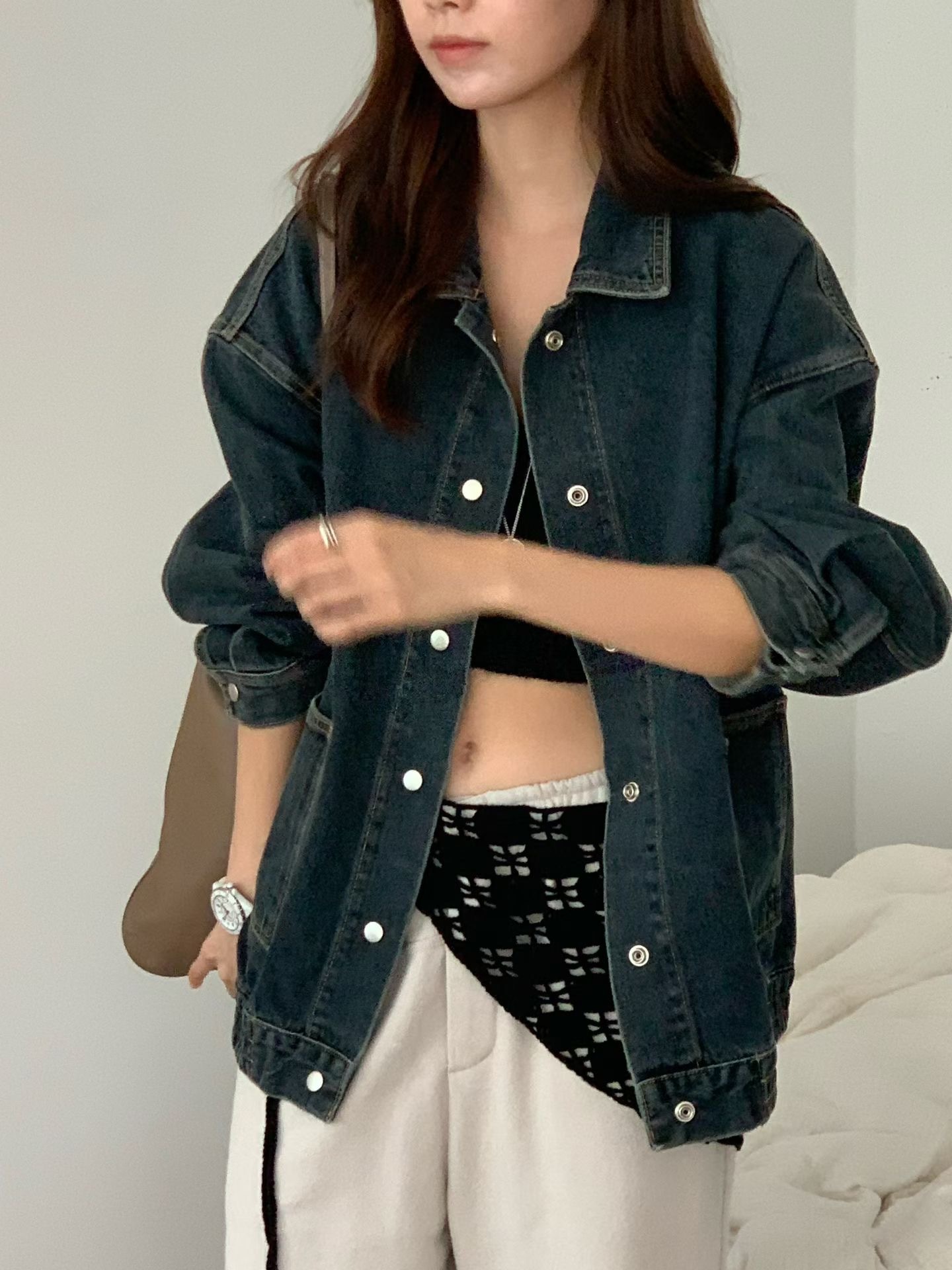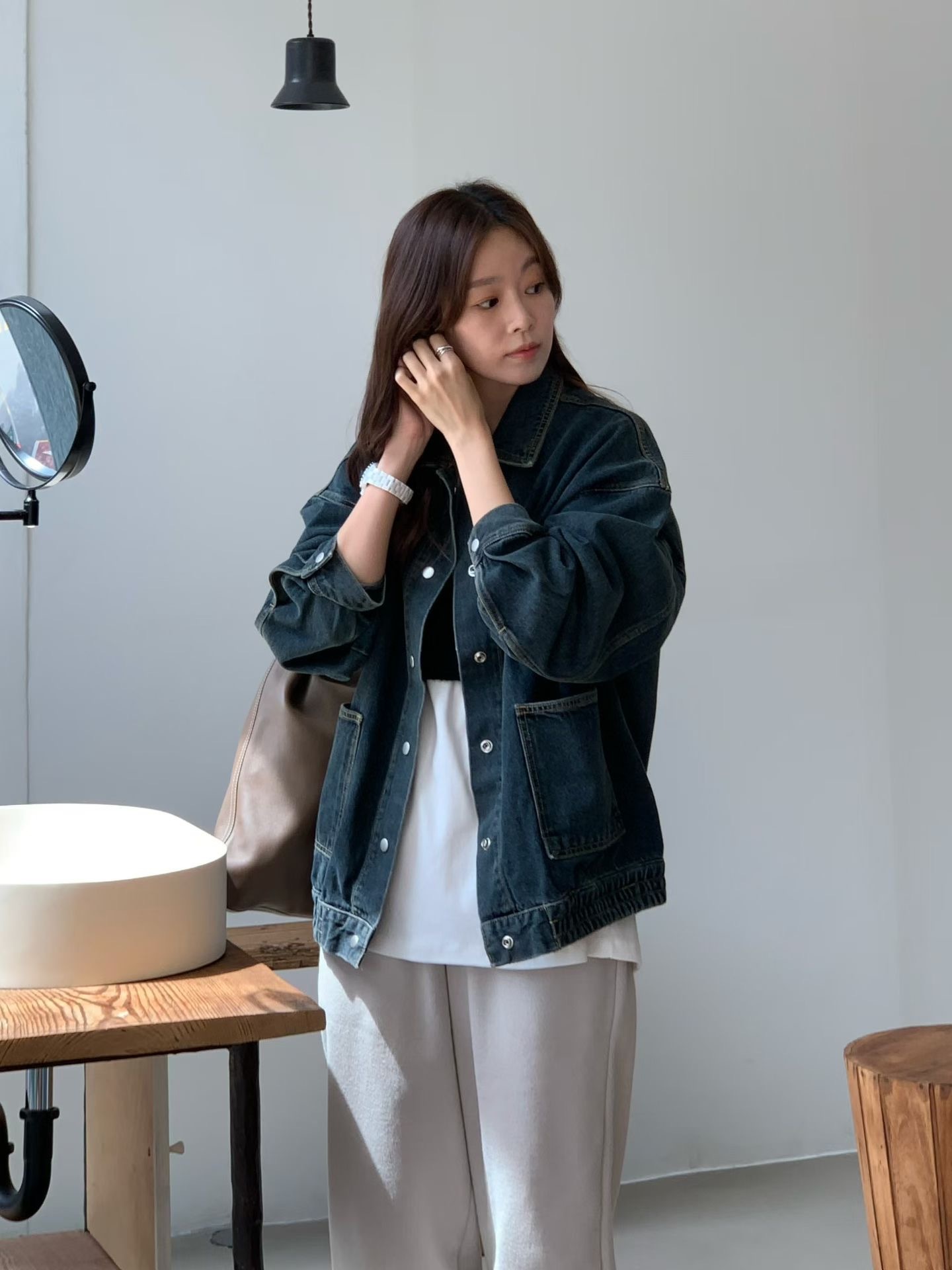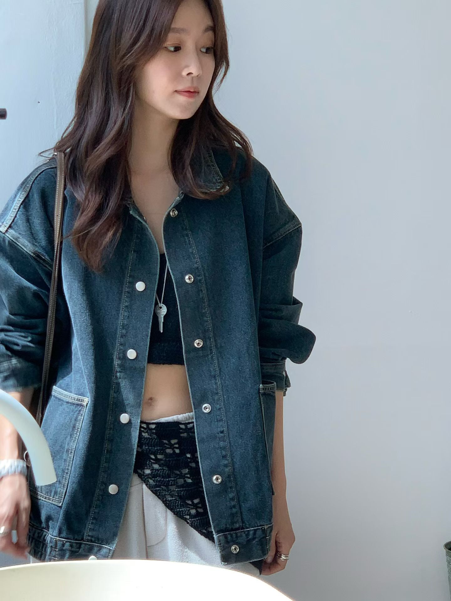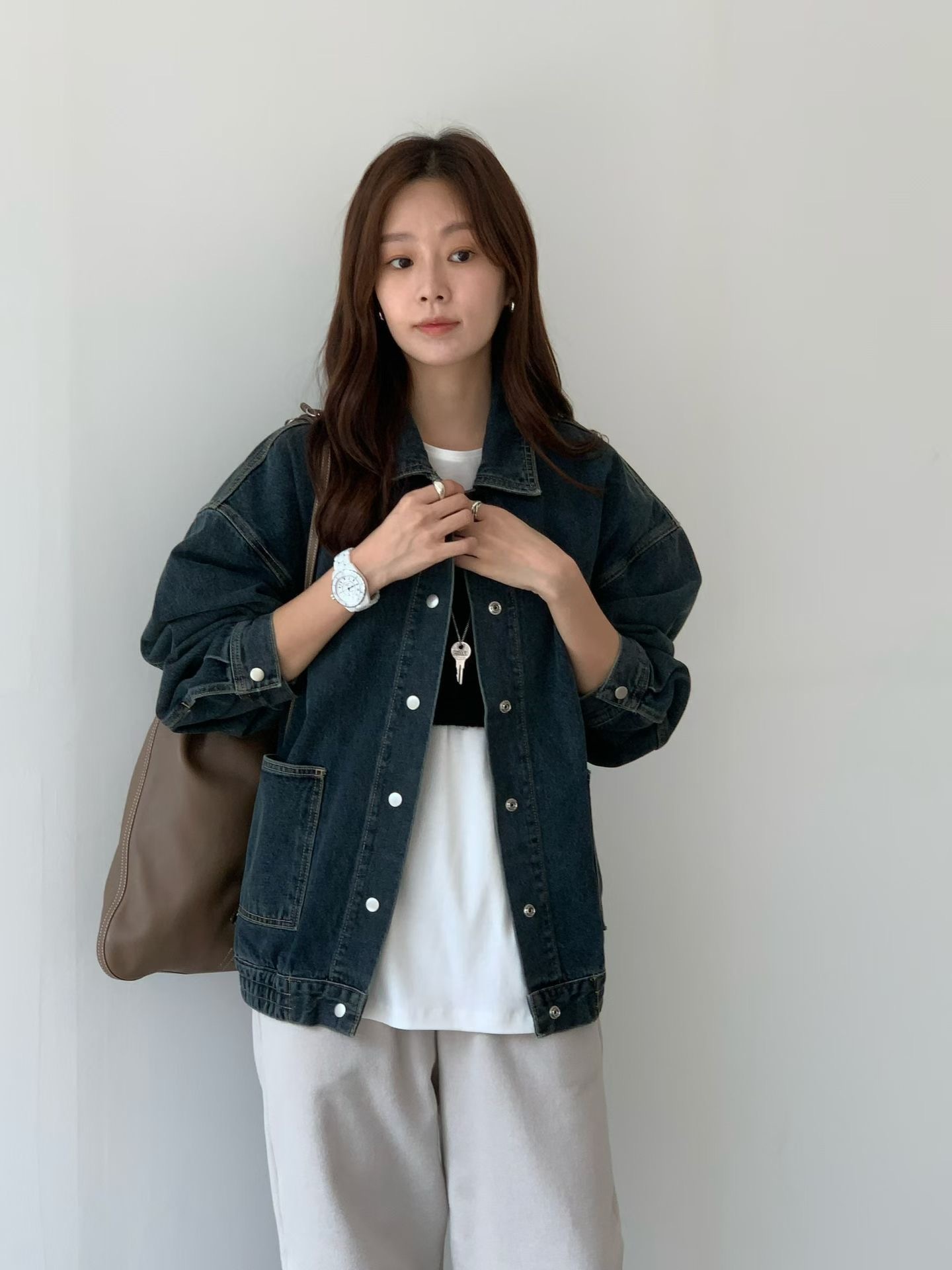肩膀落肩 有點慵懶隨性的感覺 是偏深一點的牛仔藍色
